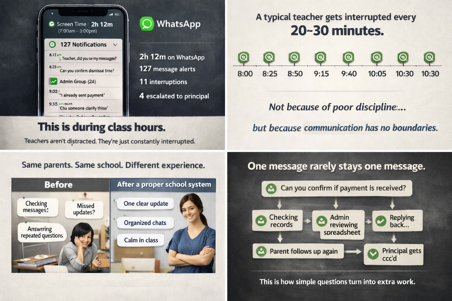 School A continues relying on WhatsApp. Communication works – but only because teachers and admins absorb the stress.